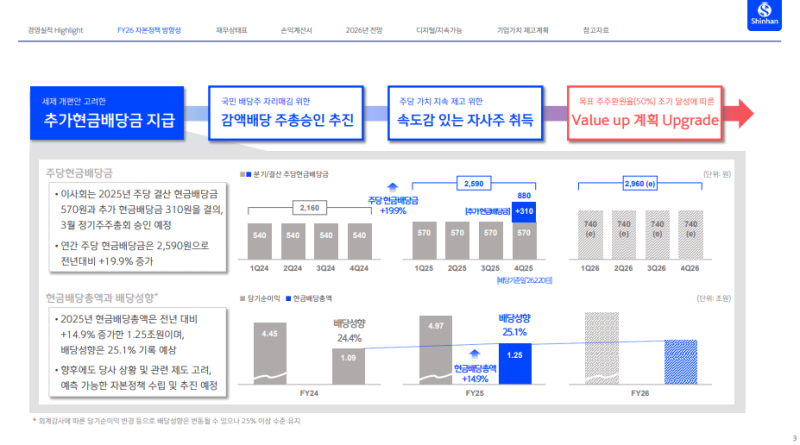 • 자사주 정책은 전년과 유사하거나 그 이상 규모 집행 가능 구도이며 현금 배당 비중 확대는 비율 급등이 아닌 기존 기업 가치 제고 계획상 점진적 확대 기조의 연장선