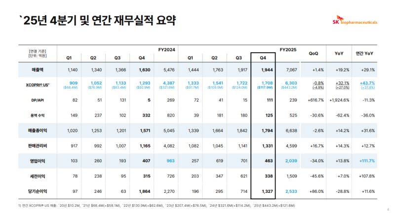 • 2025년 연결 기준 연간 매출액 7,067억원(YoY +29.1%), 4Q25 매출 1,944억원(QoQ +1.4%, YoY +19.2%)