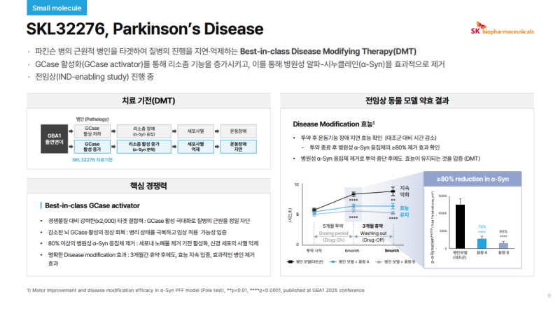 • CNS 영역에서 파킨슨병 치료제로 개발 중인 SKL32276, 증상 완화 중심 치료제와 달리 질병의 근원을 표적하는 Disease Modifying Therapy(DMT) 전략