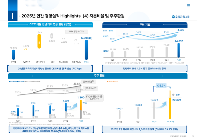 • 2025년 말 그룹 보통주자본비율(CET1) 잠정치 12.9%
