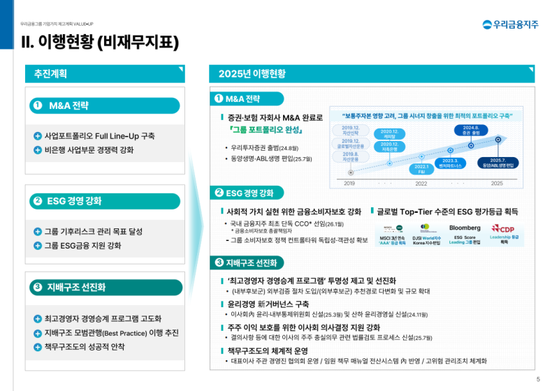• 보험사 인수 등 대형 M&A에도 견조한 이익 증가, 자산 리밸런싱, 환율 민감 자산 감축, RORWA 연계 평가 및 지표·시스템 운영 고도화 반영