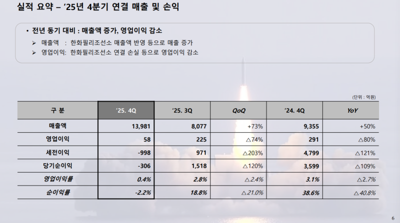 • 2025년 4분기 연결 기준 매출액: 1조 3,981억 원, 영업이익: 94억 원, 당기순손실: 239억 원