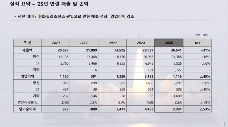• 방산 내 우주와 항공을 합산해 설명하고 있으나 2025년에는 대부분이 우주 사업 매출에 해당