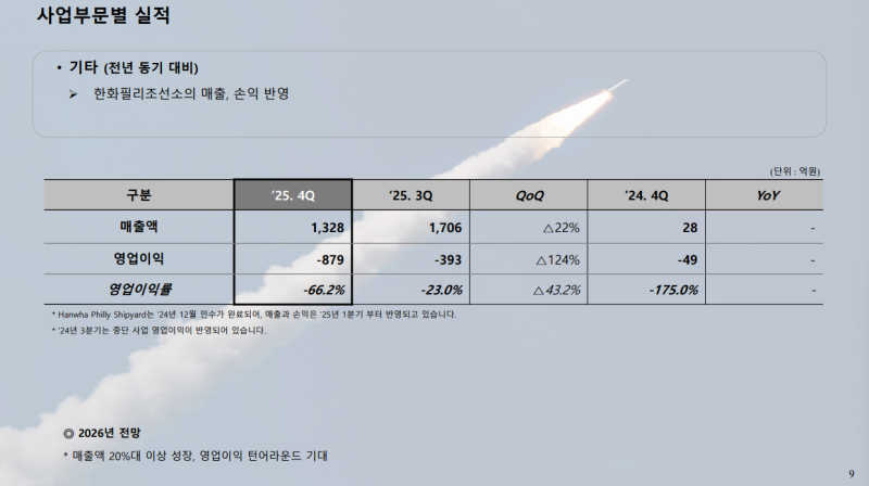 Q. 필리조선소의 영업손실이 기타 부문에 포함돼 있는 것으로 보이는데 필리조선소 단독 기준 손실 규모와 2026년 매출·손익·오피마진 흐름은 어떻게 보는지?
