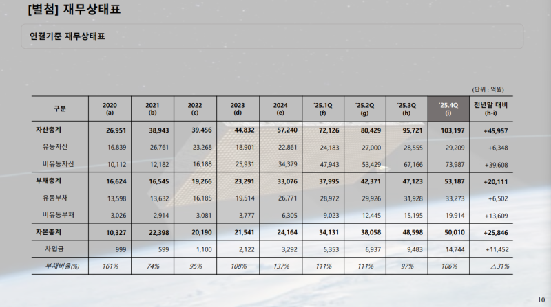 • 작년 말 대비 자산총계는 10조 3,197억 원으로 증가, 전년 대비 증가액 4조 5,957억 원