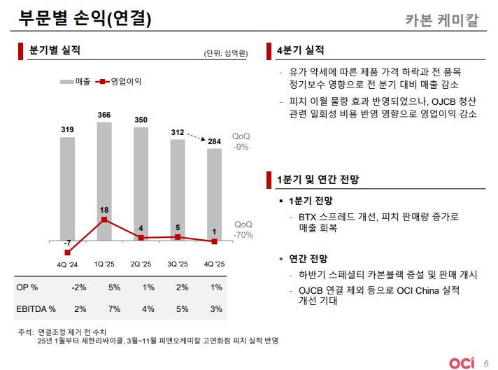 • 중국 카본블랙 생산 법인 오제이씨(OJCB) 청산 관련 재고 및 유무형자산 손상 반영으로 4Q25 일회성 비용 발생