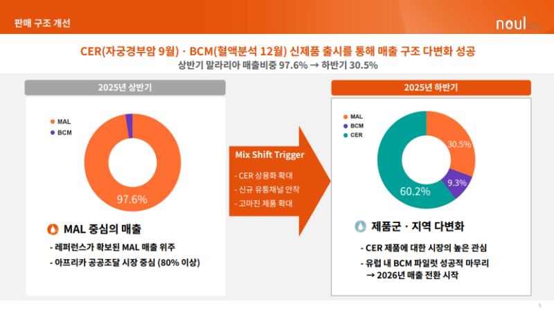 • 말라리아 매출 비중 97.6% → 30.5% 하락, 신제품 CER·BCM 매출 전환 시작