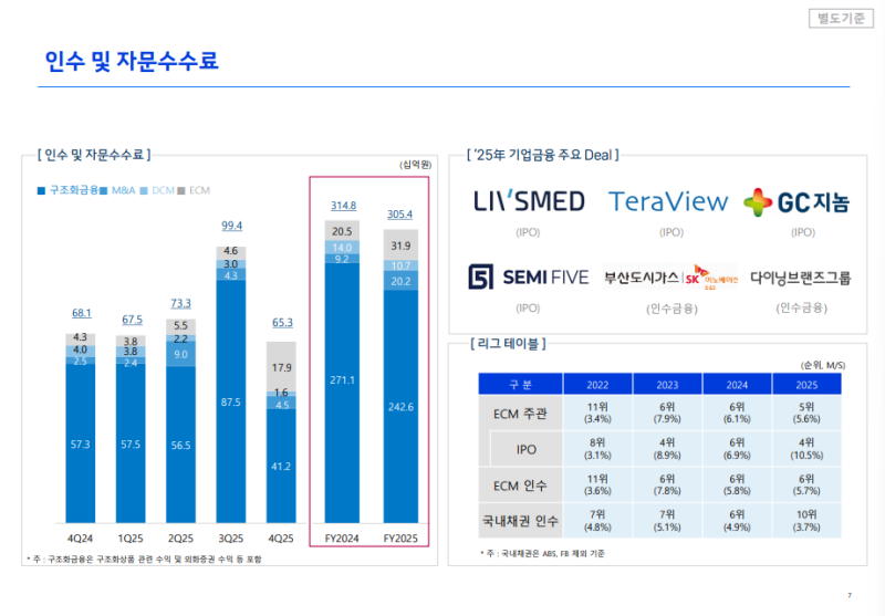 • 2025년 인수 및 자문수수료: 3,054억 원 (YoY -3.0%) 기록하며 전년 대비 소폭 감소
