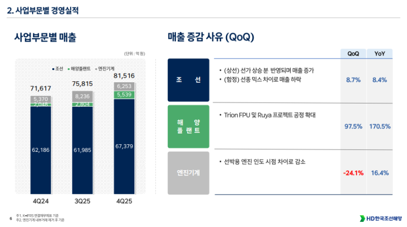 • 해당 일회성 요인에 따른 기저 영향으로 4Q25 조선 부문 영업이익은 전분기 대비 0.4% 감소, 전년 동기 대비 79.3% 증가 흐름 (QoQ -0.4%, YoY +79.3%)