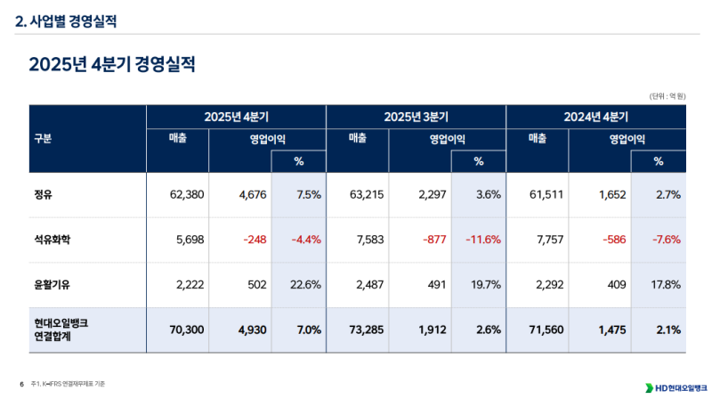 • HD현대오일뱅크 연결 매출 7조 300억 원, 영업이익 4,930억 원 기록, 영업이익률 7.0%