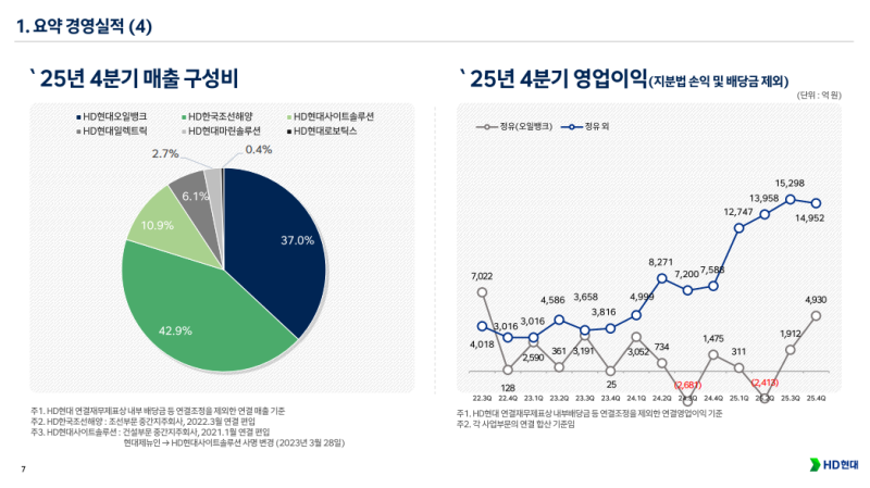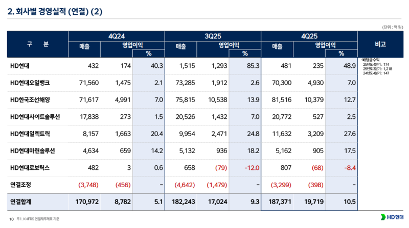 • HD현대 4Q25 영업이익 1조9,719억 원 기록 (QoQ +15.8%, YoY +124.5%)하며 조선·정유·전력기기 전반 실적 개선 확인
