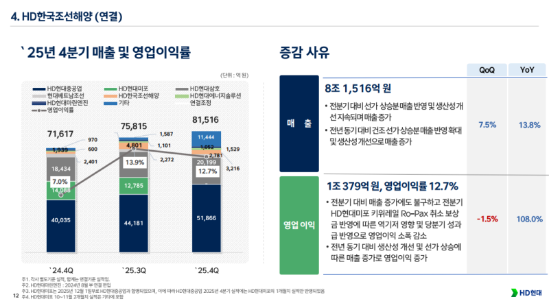 • HD한국조선해양 연결 매출 8조 1,516억 원, 영업이익 1조 379억 원 기록, 영업이익률 12.7%